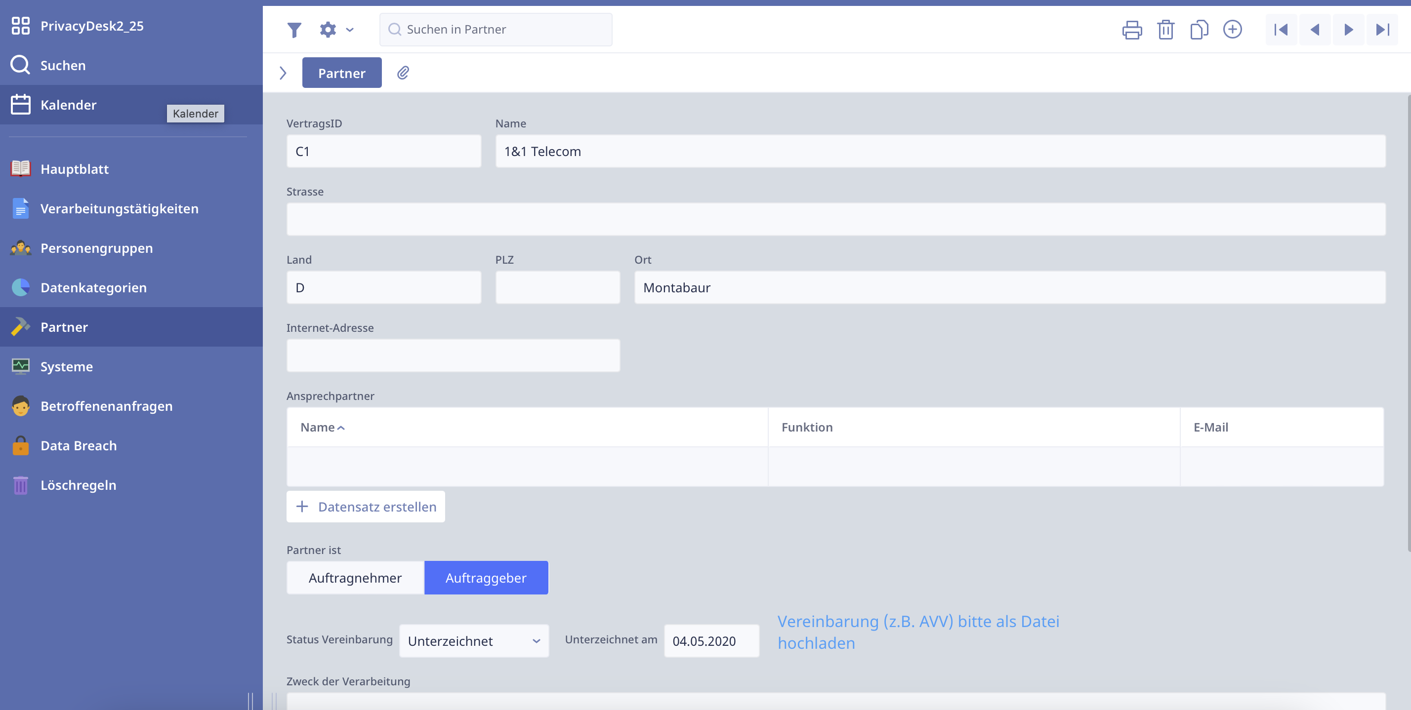 privacy:desk ermöglicht die übersichtliche Dokumentation der beauftragten Dienstleister, die Zuordnung zu den Verfahren und die Ablage der zugehörigen Verträge.