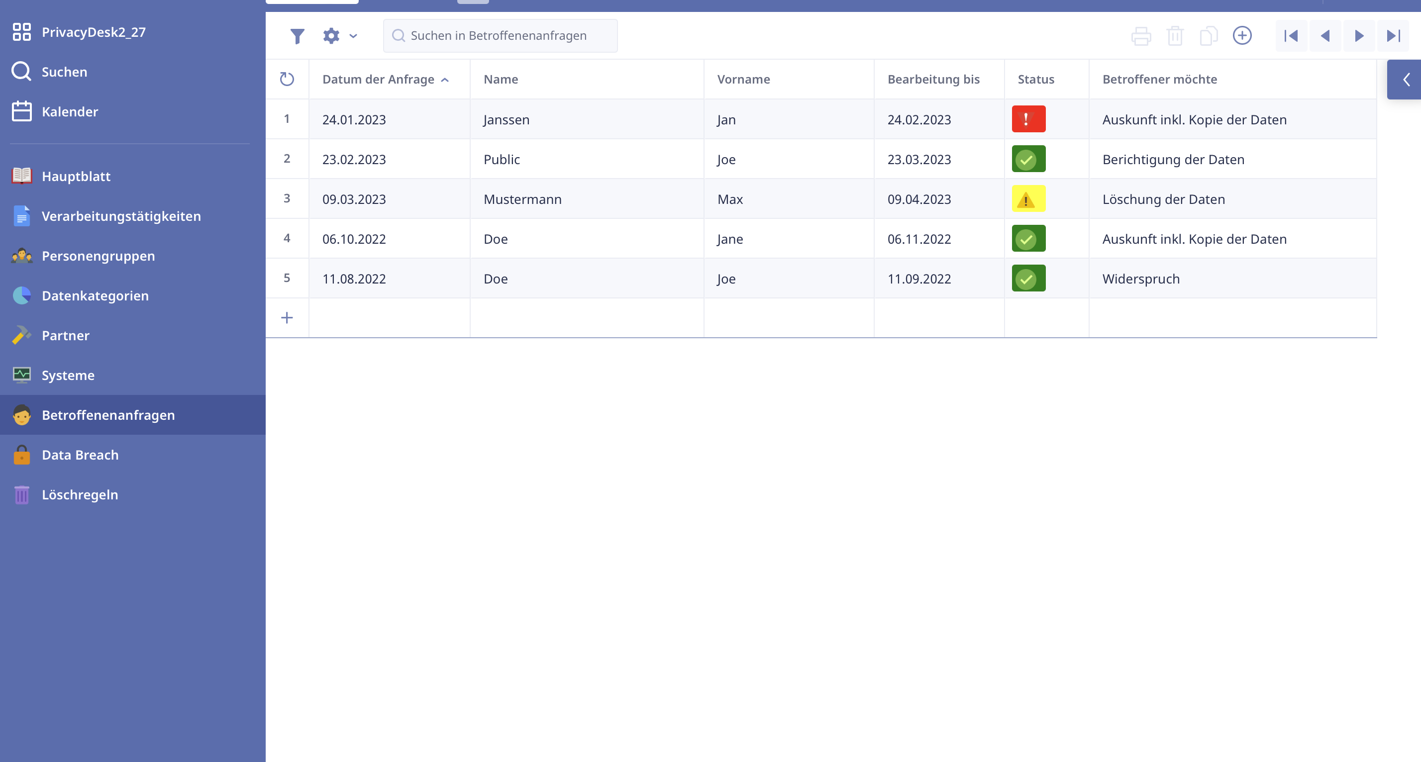 Betroffenenrechte beschreiben die Rechte der von der Datenverarbeitung betroffenen Personen und dienen der Information, Transparenz und dem Schutz der informationellen Selbstbestimmung. Gemäß Art. 12 Abs. 3 DSGVO müssen Betroffenenanfragen spätestens innerhalb eines Monats beantwortet werden. Mithilfe von privacy:desk kann die Beantwortung von Betroffenenanfragen koordiniert und dokumentiert werden, um eine fristgerechte Beantwortung der Anfragen sowie die Erfüllung gesetzlicher Anforderungen sicherzustellen.