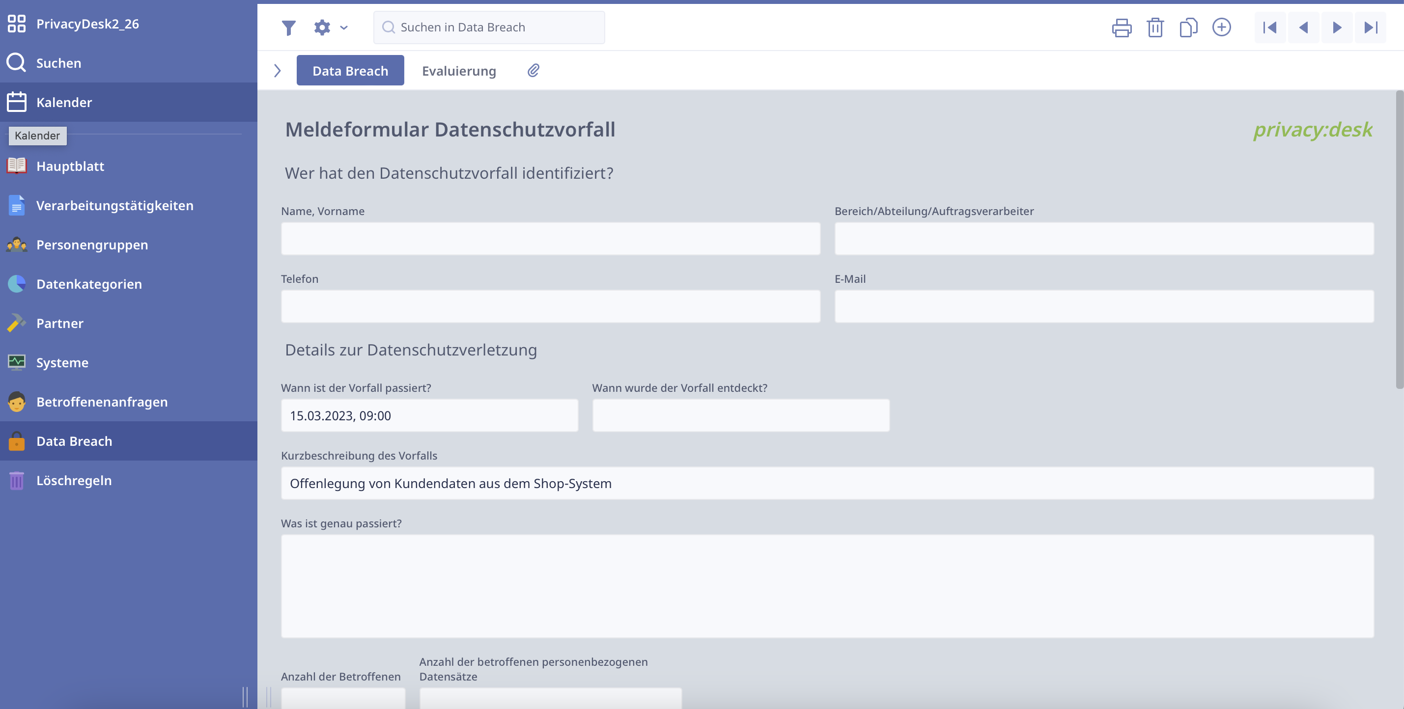 Kommt es zu einem Datenschutzvorfall, so ist umsichtiges und schnelles Handeln von größter Wichtigkeit. Aus diesem Grund sollte für den Fall, dass ein Datenschutzvorfall erkannt wird, ein Leitfaden zur Ergreifung der richtigen Schritte existieren. Welche Risiken mit einer Datenpanne einhergehen und ob eine Meldung an die zuständige Aufsichtsbehörde sowie die betroffenen Personen erfolgen muss, hängt von mehrern Faktoren ab. privacy:desk unterstützt Sie neben der Dokumentation auch bei der Evaluierung des Datenschutzvorfalls und gibt einen groben Leitfaden zur Behandlung von Datenschutzvorfällen.