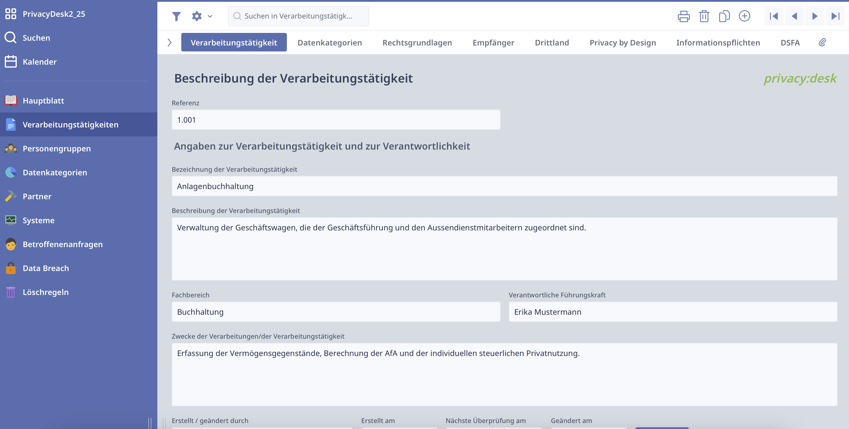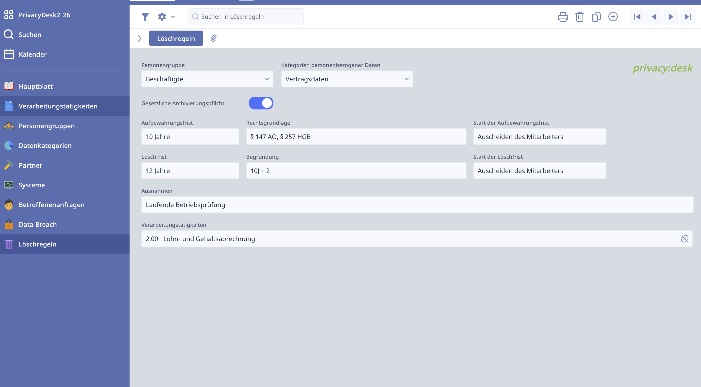Die datenschutzrelevante Dokumentation wie VVT, AVV, Löschregeln usw. werden zentral in privacy:desk abgelegt und verwaltet.
